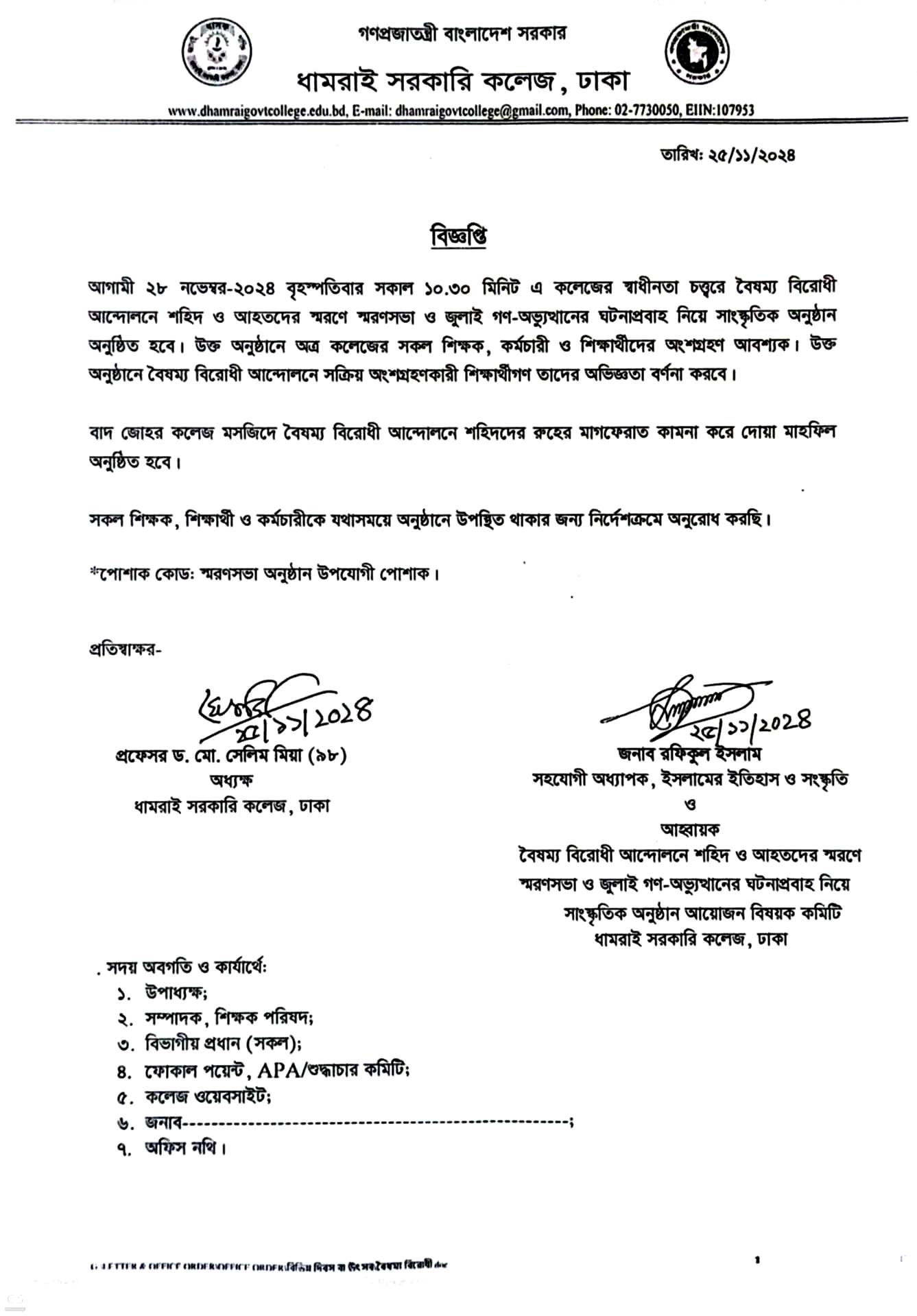 Notice Title : বৈষম্য বিরোধী আন্দোলনে শহিদ ও আহতদের স্মরণে স্মরণসভা ও জুলাই গণ-অভ্যুত্থানের ঘটনাপ্রবাহ নিয়ে সাংস্কৃতিক অনুষ্ঠান আয়োজন