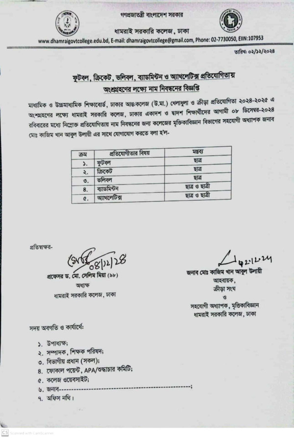 Notice Title : ফুটবল, ক্রিকেট, ব্যাডমিন্টন ও অ্যাথলেটিক্স প্রতিযোগিতায় অংগ্রহণের লক্ষ্যে নাম নিবন্ধনের বিজ্ঞপ্তি