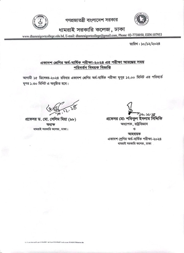 Notice Title : একাদশ শ্রেণির অর্ধ-বার্ষিক পরীক্ষা-২০২৪ এর সময়সূচি পরিবর্তন