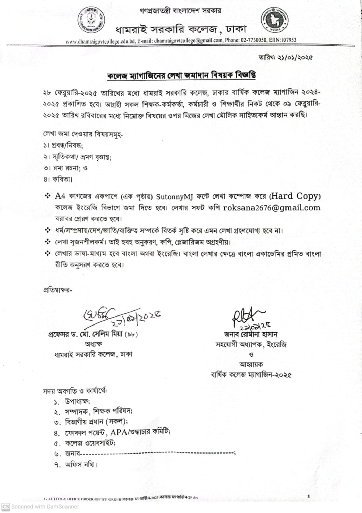 Notice Title : কলেজ ম্যাগাজিন এর লেখা আহ্বান বিষয়ক বিজ্ঞপ্তি