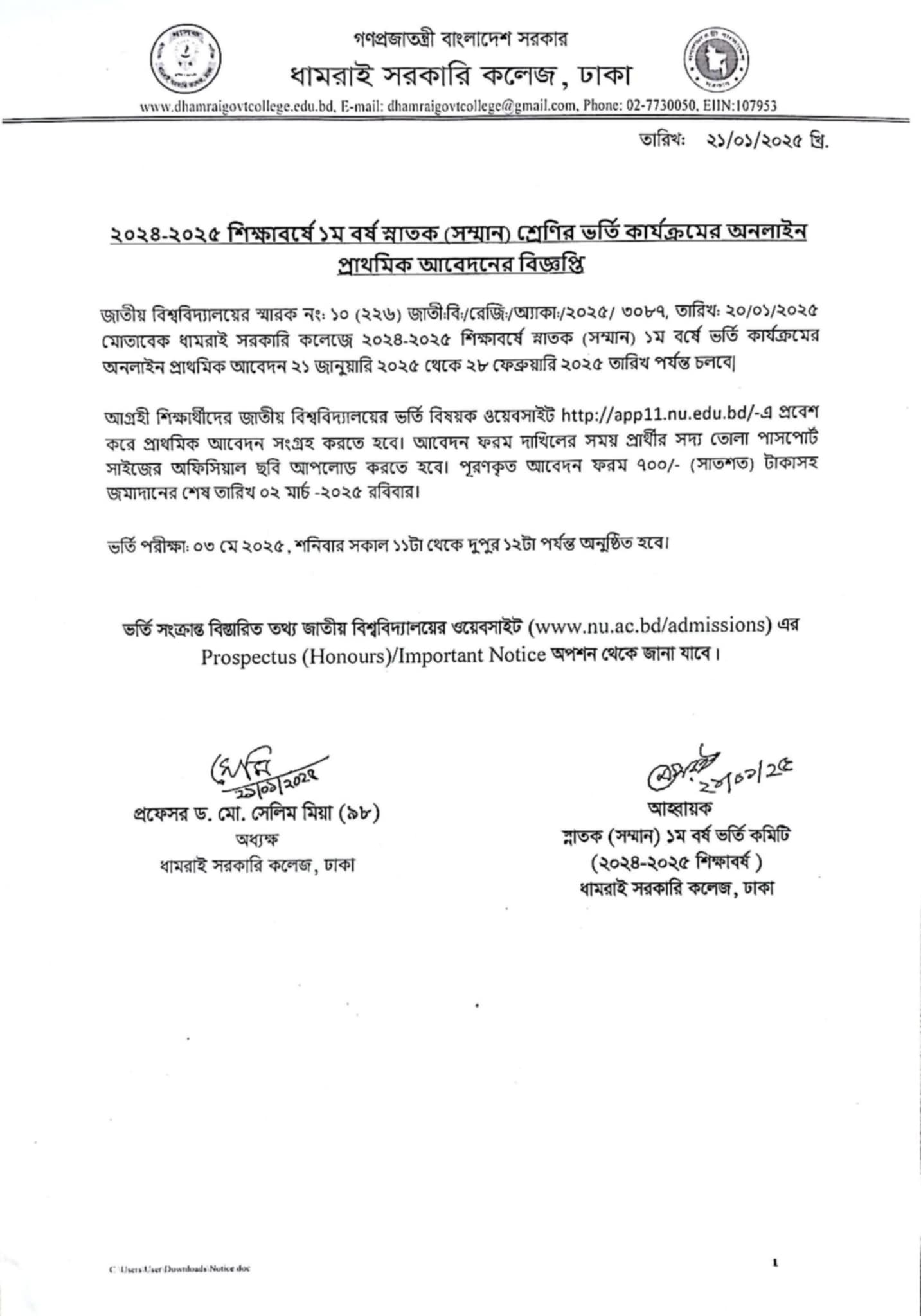Notice Title : স্নাতক সম্মান ১ম বর্ষ (শিক্ষাবর্ষ : ২০২৪-২০২৫) ভর্তি বিজ্ঞপ্তি
