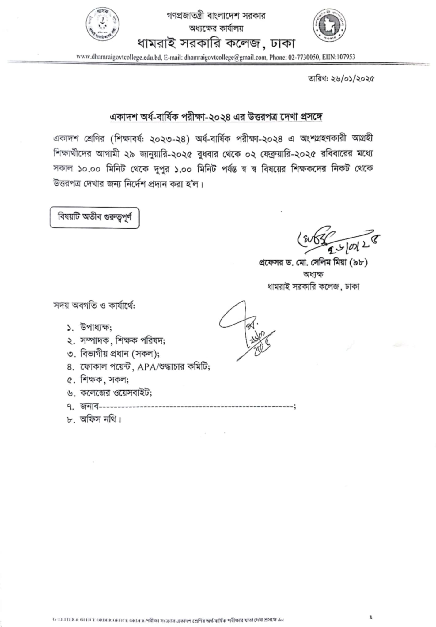 Notice Title : একাদশ শ্রেণির অর্ধ-বার্ষিক পরীক্ষা-২০২৪ এর উত্তরপত্র দেখা প্রসঙ্গে
