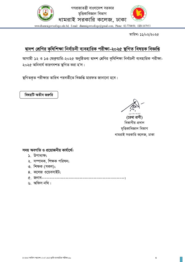 Notice Title : দ্বাদশ শ্রেণির নির্বাচনী কৃষিশিক্ষা ব্যবহারিক পরীক্ষা-২০২৫ স্থগিতের বিজ্ঞপ্তি