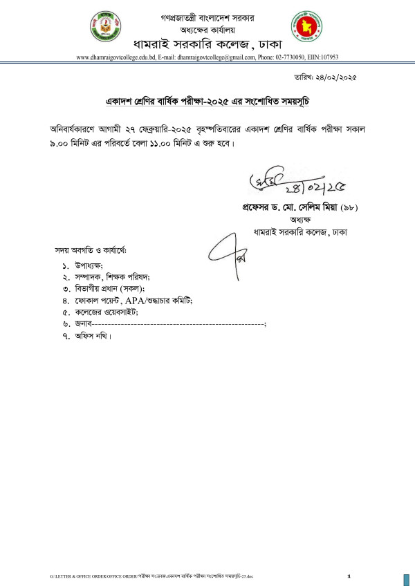 Notice Title : একাদশ শ্রেণির বার্ষিক পরীক্ষা-২০২৫ এর সংশোধিত সময়সূচি