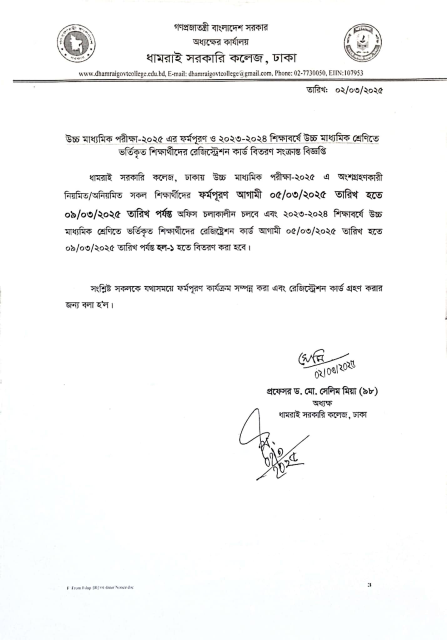 Notice Title : উচ্চ মাধ্যমিক পরীক্ষা ২০২৫ এর ফর্ম পূরণ ও রেজিস্ট্রেশন কার্ড বিতরণ বিষয়ক বিজ্ঞপ্তি