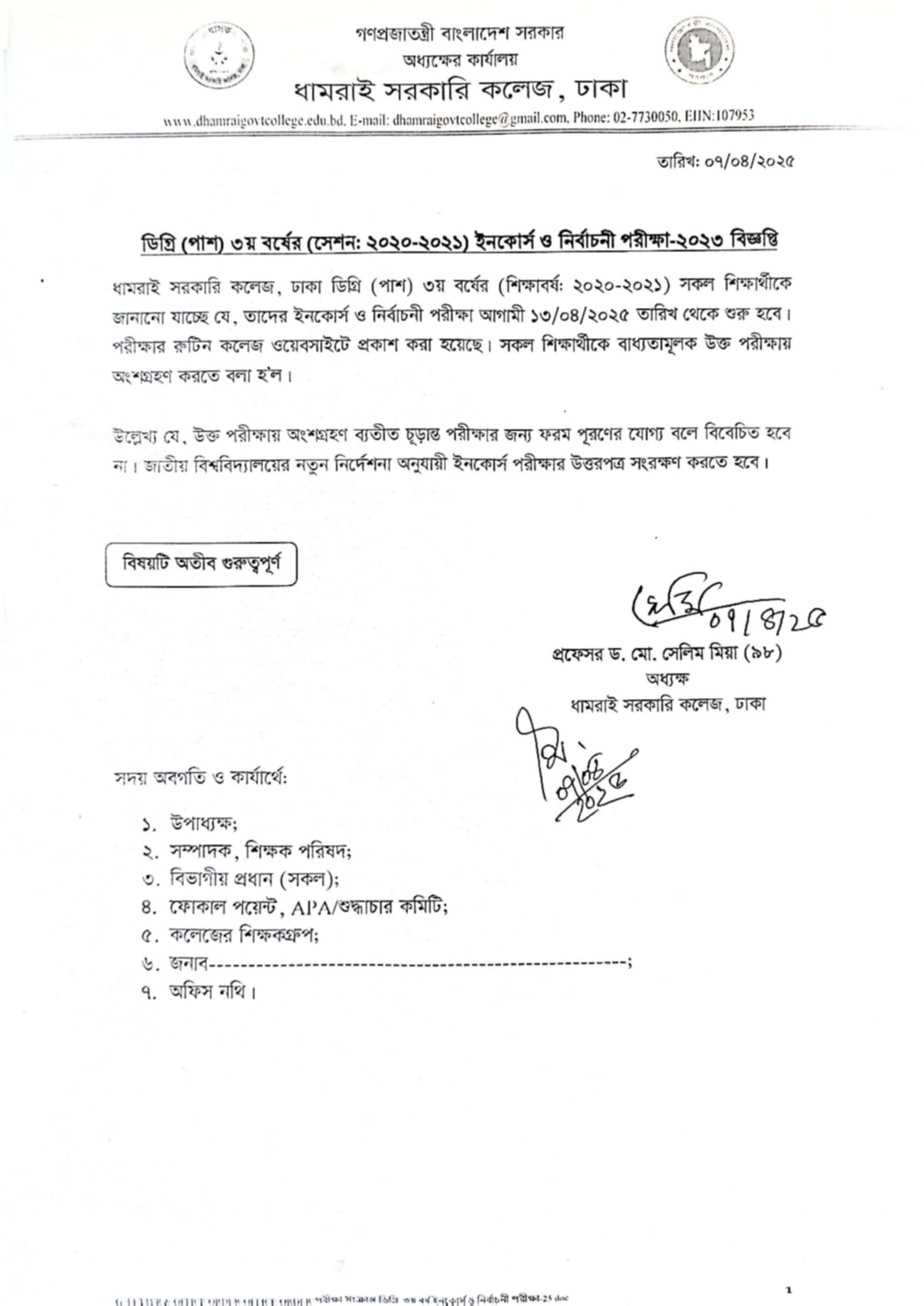 Notice Title : ডিগ্রি ৩য় বর্ষ ইনকোর্স ও নির্বাচনী পরীক্ষা-২০২৩ সংক্রান্ত বিজ্ঞপ্তি