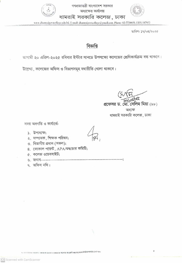 Notice Title : ইস্টার সানডে উপলক্ষ্যে কলেজের শ্রেণিকার্যকম বন্ধের বিজ্ঞপ্তি