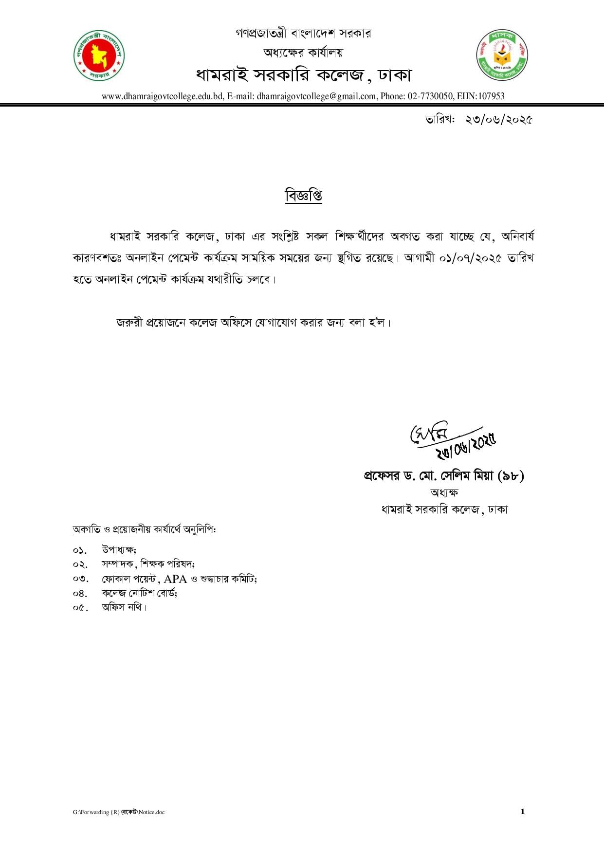 Notice Title : অনলাইন পেমেন্ট স্থগিত বিষয়ক বিজ্ঞপ্তি