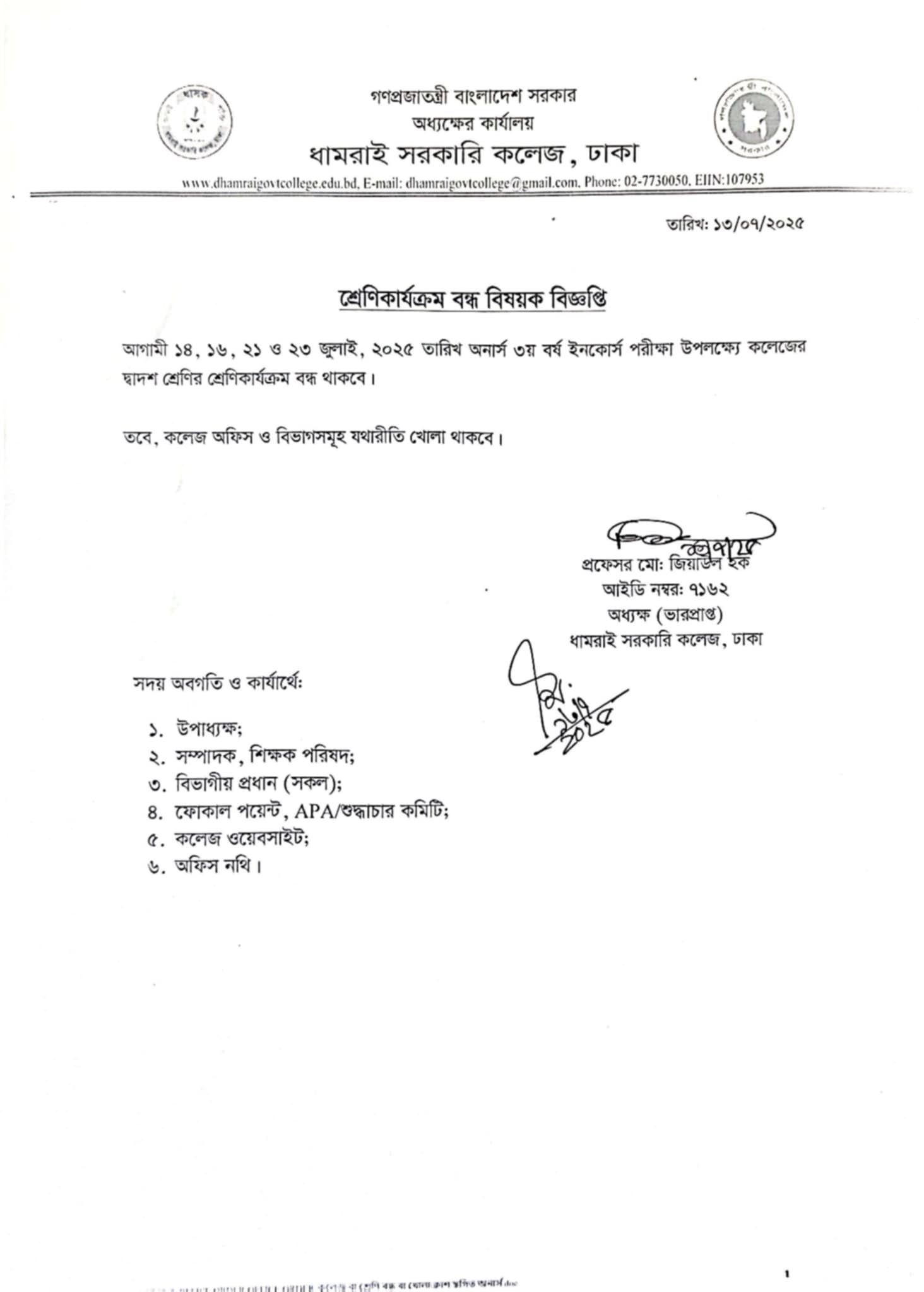 Notice Title : শ্রেণিকার্যক্রম বন্ধের বিজ্ঞপ্তি