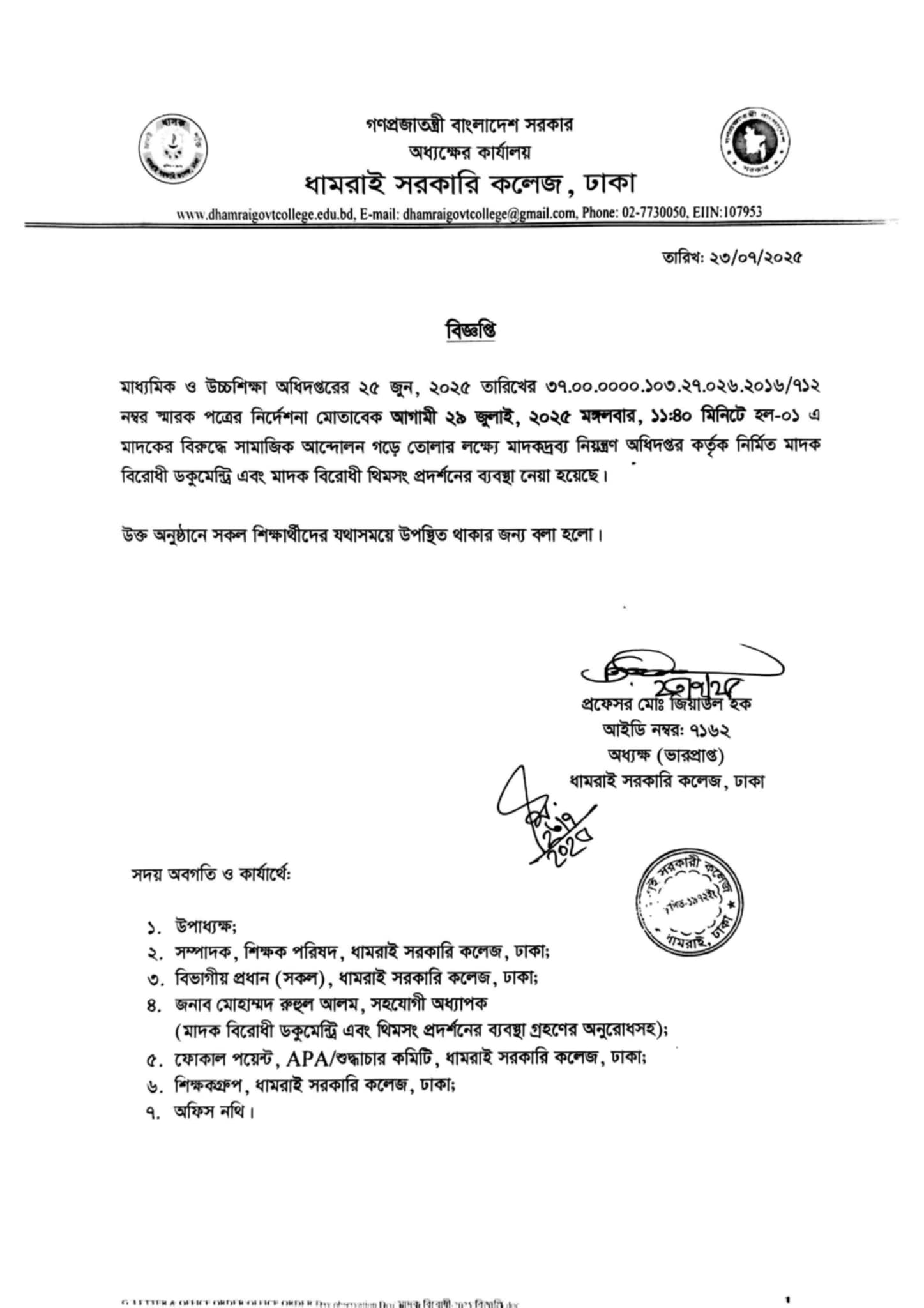 Notice Title : মাদক বিরোধী ডকুমেন্ট্রি ও থিমসং প্রদর্শনী বিষয়ক বিজ্ঞপ্তি