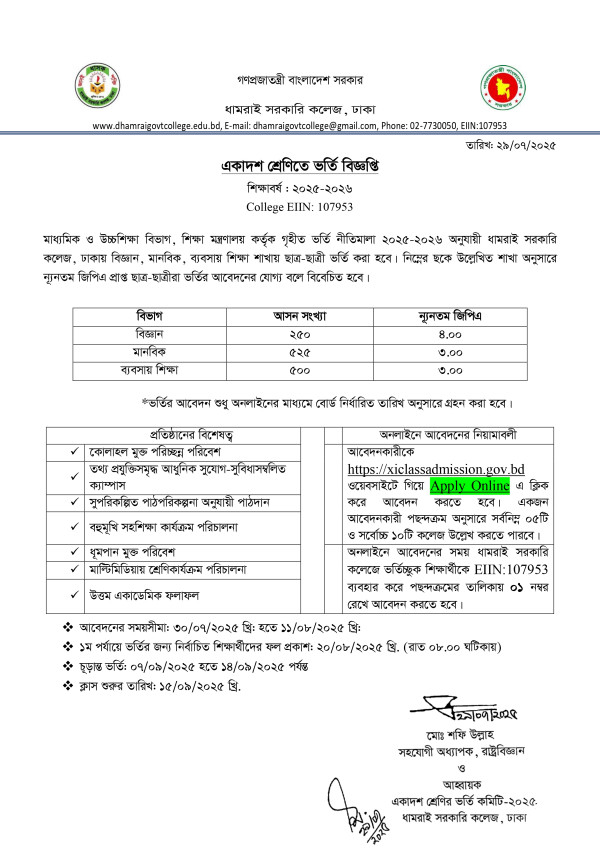 Notice Title : একাদশ শ্রেণির ভর্তি বিজ্ঞপ্তি- ২০২৫