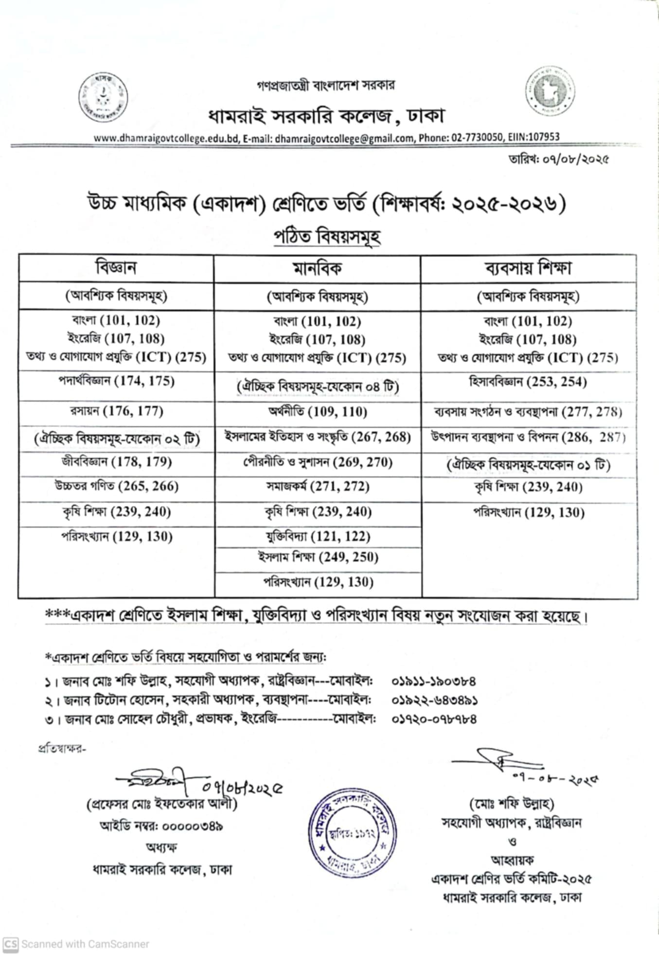 Notice Title : উচ্চ মাধ্যমিক (একাদশ) শ্রেণিতে পঠিত বিষয়সমূহ