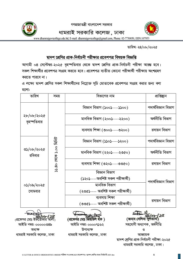 Notice Title : দ্বাদশ শ্রেণির প্রাক-নির্বাচনী পরীক্ষার শিক্ষার্থীদের প্রবেশপত্র সংগ্রহ বিষয়ক বিজ্ঞপ্তি