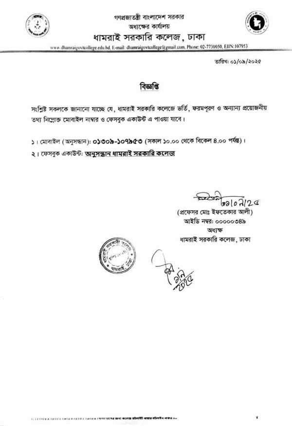 Notice Title : কলেজে ভর্তি, ফরমপূরণ ও অন্যান্য প্রয়োজনীয় তথ্যের জন্য যোগাযোগ বিষয়ক বিজ্ঞপ্তি