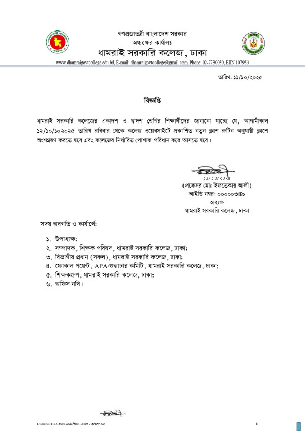 Notice Title : একাদশ ও দ্বাদশ শ্রেণির নতুন ক্লাস রুটিন ও কলেজ ড্রেস পরিধান বিজ্ঞপ্তি