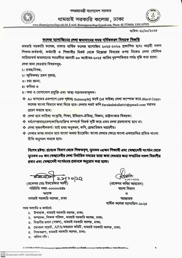 Notice Title : কলেজ ম্যাগাজিনের লেখা জমাদানের সময় বৃদ্ধিকরণ বিষয়ক বিজ্ঞপ্তি