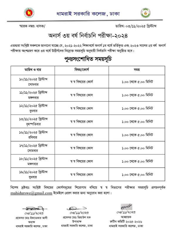Notice Title : অনার্স ৩য় বর্ষ পুন:সংশোধিত নির্বাচনী পরীক্ষা-২০২৪ এর সময়সূচি