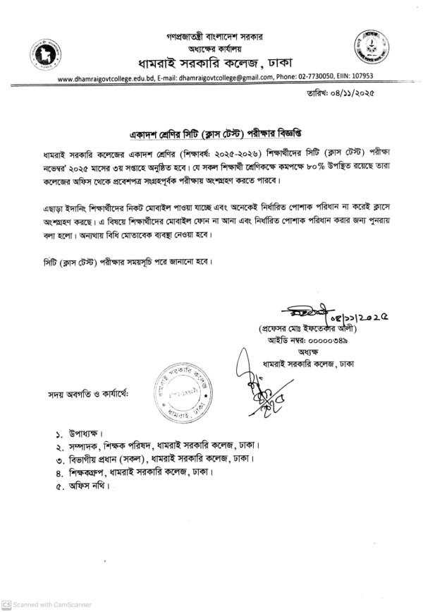 Notice Title : একাদশ শ্রেণির সিটি (ক্লাস টেস্ট) পরীক্ষার বিজ্ঞপ্তি
