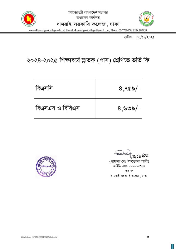 Notice Title : ২০২৪-২৫ শিক্ষাবর্ষে স্নাতক পাস ১ম বর্ষে ভর্তি ফি