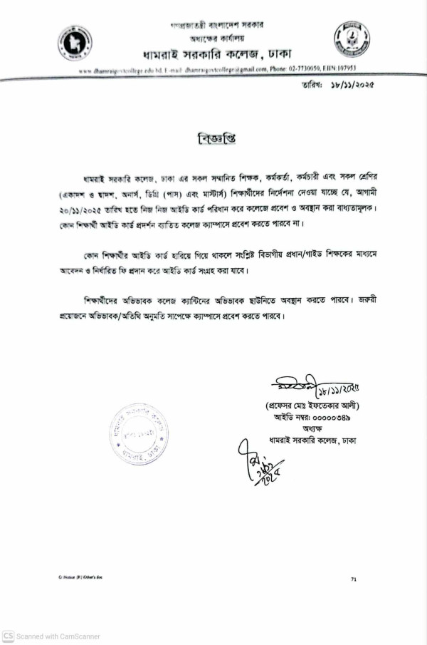 Notice Title : কলেজ পরিচয় পত্র পরিধান বিষয়ক বিজ্ঞপ্তি