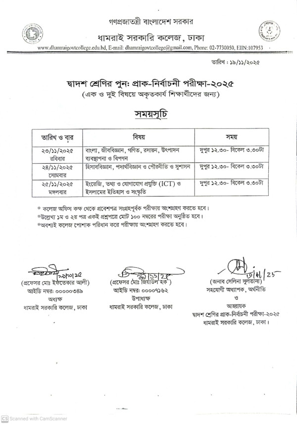 Notice Title : পুন: প্রাক-নির্বাচনী পরীক্ষা-২০২৫ এর সময়সূচি (এক ও দুই বিষয়ে অকৃতকার্য শিক্ষার্থীদের জন্য)