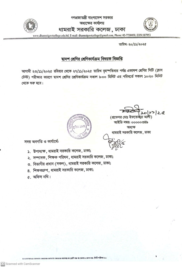 Notice Title : দ্বাদশ শ্রেণির শ্রেণিকার্যক্রম বিষয়ক বিজ্ঞপ্তি