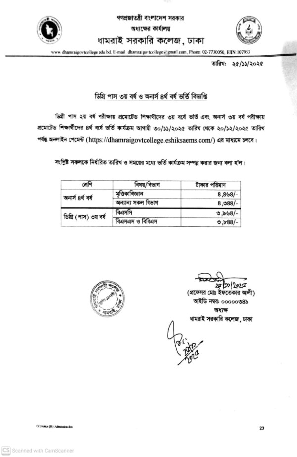 Notice Title : ডিগ্রি ৩য় বর্ষ ও অনার্স ৪র্থ বর্ষ ভর্তি বিজ্ঞপ্তি